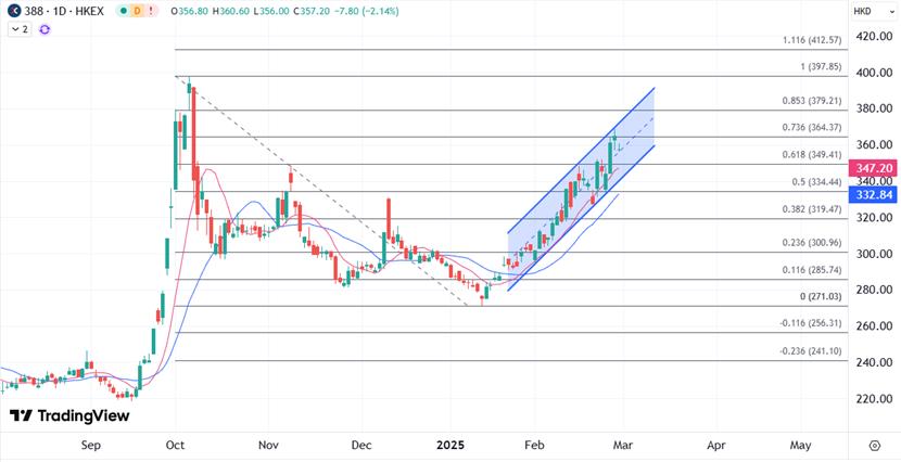 昨日公布预计整体符合预期,因此港交所股价延续了升势但显得温和,当前股价继续处于自1月中旬低位以来的回升趋势中,所以随着进入前期高位范围,重点关注380至400港元的关键阻力,在业绩行情后,需要看大市能否维持强劲的升势提供利好的氛围。