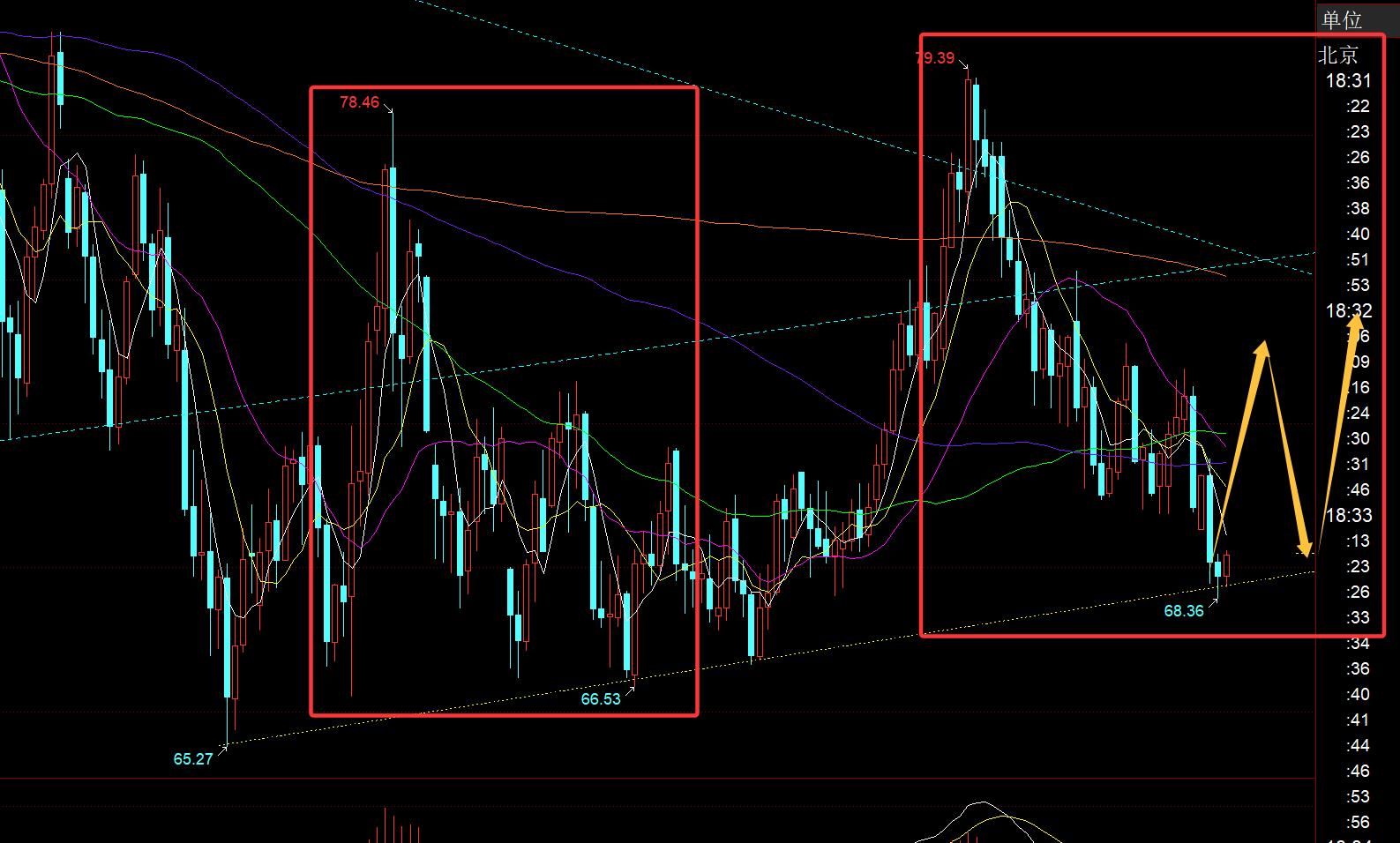 原油方面:从日线上图看,规律性仍可循;一方面底部趋势支撑线刚好再次测试,68.5一线是一直讲的关键支撑,前期一路看跌的最终目标;到位之后,就按计划尝试一波超跌反弹,一旦成功,预计还会反复去73一线,然后反复打压底部趋势支撑线,再反复企稳,这个过程持续一两个月,最后再来一波一千点上的拉升;所以,几个月的整体规划已经透露了,是否严格执行看个人,需要很大耐心才能抵达你心中原本的目标;