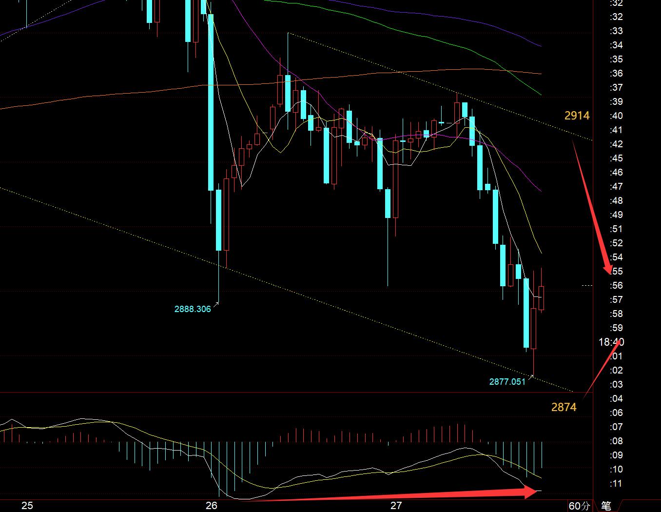 从当下日线级别看,打到了日线中轨,后续有几个关键支撑需关注企稳信号,一个是2876,属于前期14日至17日起涨点,一个是2868,属于2582-2956的236分割支撑,最后一次就是2863,属于高位整理最后一次起涨点;还是那句话,只要2863未有效破位失守,那么修正就不会深调,切勿低位破支撑后去追跌,因为整体的趋势依然很强,360美金的单边涨幅才回调了一个零头;当然对于今日来讲,一路下跌短期弱势,欧盘反弹力度也不大,今晚还有二次下行概率,只不过入场点至少要靠近小时线中轨承压再出手,强压是上图的通道上轨2914下,下轨支撑2874-76,先围绕此区间来震荡对待;