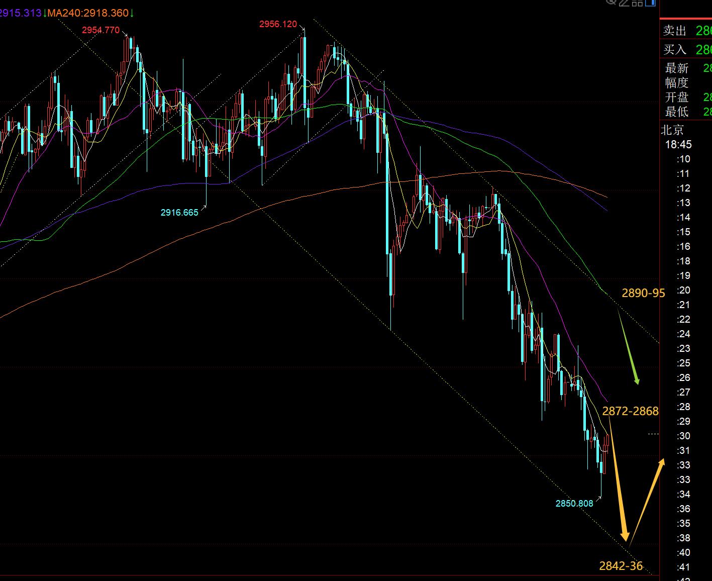 第二,黄金小时线级别:从上图看,结合这几日的弱势打压,规划出新的运行下行通道,由于欧盘整体还是有些无力,美盘可能还有二次下跌空间,阻力关注2868顶底位置,以及中轨2872,也刚好是日内跌幅618分割阻力,只要站不稳中轨,那么向下还有进一步延续空间,下轨指向2842-2836范围,这里是可以尝试企稳看反弹需求的(短周期macd的底背离也会起到共振);晚间有一个重要的PCE数据,若出现拉高,刺穿了中轨,那么上方等通道上轨2890-95附近承压再去试探看跌回落,那样就是转宽幅震荡了;