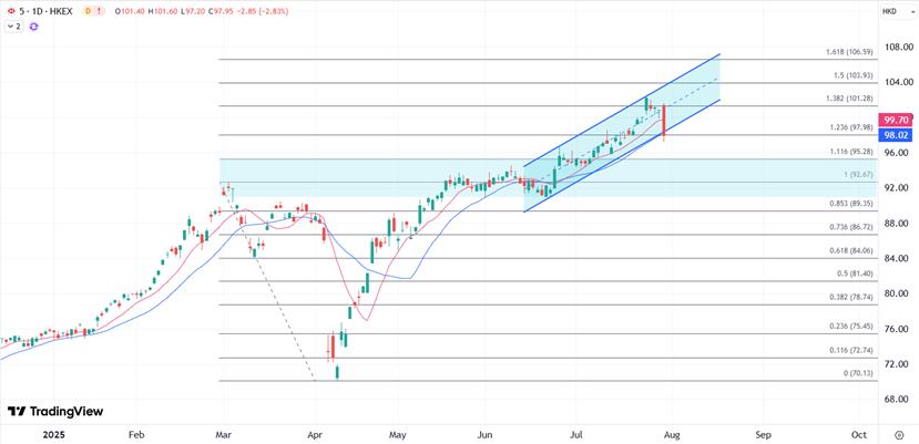 最新业绩不及预期,反映低息环境(HIBOR明显下降)、去年同期出售加拿大和阿根廷业务入帐(完成出售加拿大银行业务後录得的48亿美元增益,阿根廷业务分类为持作出售用途後确认12亿美元减值)等因素等,以上负面市场已有预期,但盈利下滑幅度超出预期,汇控半日跌0.4%,绩后加速下滑跌3.5%,重回100港元下方。如果日内收低于20日均线,将确认脱离近期高位的信号,空头可能继续拉低股价至95至91港元水平。