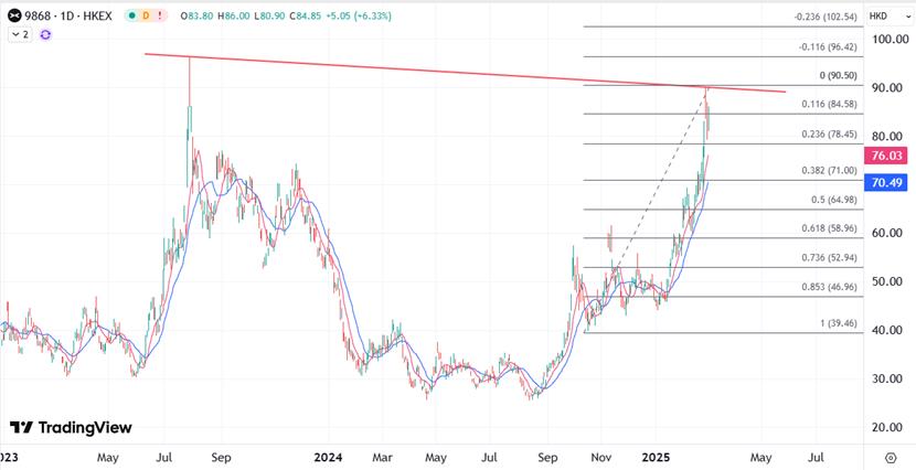 在销量的带动下,小鹏汽车股价跟随亮眼,小鹏汽车美股(XPEV.US)上周累计大涨近21%,港股今早股价也大幅高开,今年以来已经累计大涨超过80%,随着市场继续看好新车型预期和技术创新的双重驱动,小鹏股价有望继续在新势力当中保持积极的走势,有望继续挑战2023年7月创下的高位在96.30港元为目标,但目前需要先突破90港元上方。