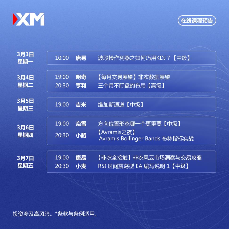 以上内容就是关于“【XM外汇市场分析】:中文在线直播讲座,本周预告”的全部内容,是由XM外汇小编认真整理编辑的,希望对你的交易有所帮助!感谢支持!