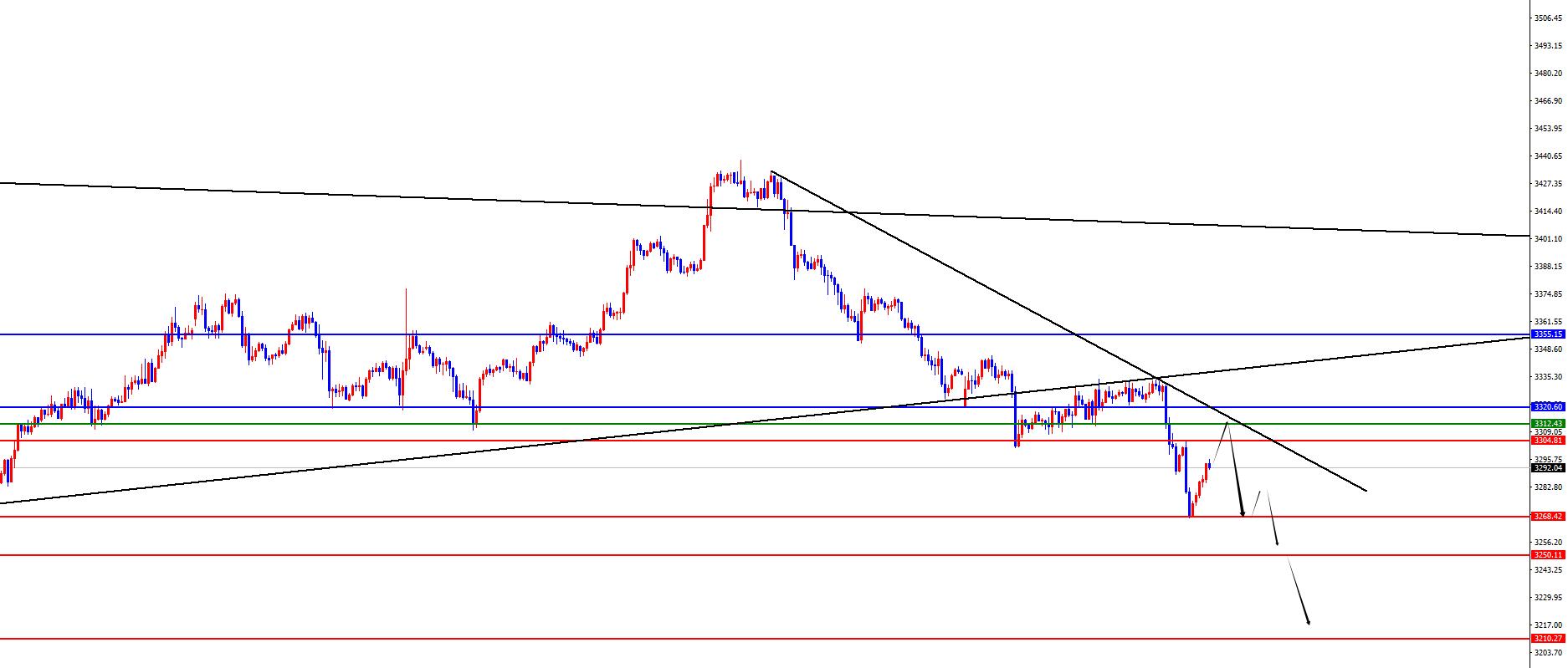 从多周期分析,首先观察月线节奏,价格在5月份正如笔者所言按照节奏运行,并且最终十字状态,6月份最终价格依旧是反K状态收尾,今天是7月份最终收盘的日子,关注最终收盘表现。从周线级别看,周线上近期价格持续高位震荡,随着时间的推移周线分水岭暂时于3320位置,在上周冲高回落后,目前价格再度进行下破,同时需要关注周线最终收盘能否收在此位置下方,一旦收在下方则后续中期空将进一步加速。按照日线级别看,价格在上周五如期跌破日线支撑位置,则前期支撑变关键阻力,目前日线阻力于3345位置,价格在此位置之下波段空对待。同时四小时上,价格在上周三跌破四小时支撑后,目前价格持续压制,后续价格只要不破四小时3312阻力则维持短期空对待。一小时上,价格经过近几日持续承压下跌后有小幅调整的迹象,目前短线上价格先关注3305位置,以及上方四小时阻力区域,价格在此区域出现反k信号后再看承压,下方关注3270-3250-3210区域。
