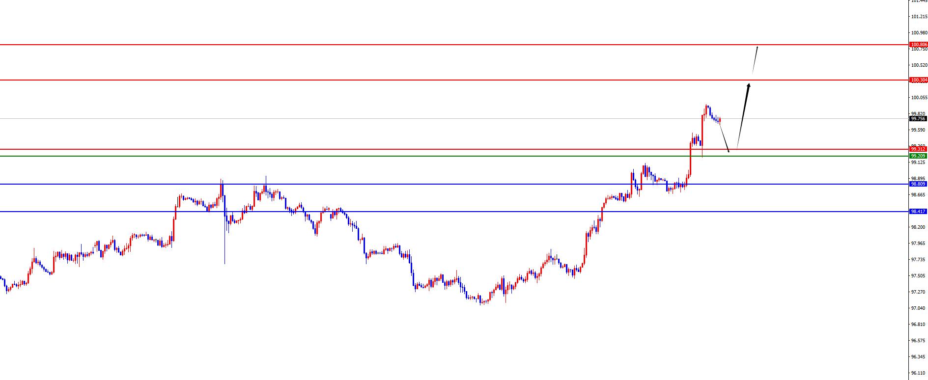 美指99.20-30区间多,防守5美金,目标100.30-100.80