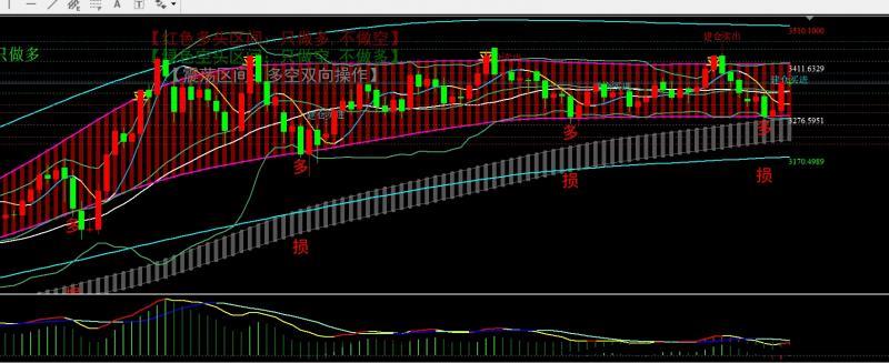 从当前走势上来看,至3500高位调整到3197以后的行情基本围绕一个宽幅大震荡,价格基本在日图上下轨之间运行,这一波的3438.5到3267也一样,价格虚破上轨开始下行,同样虚破下轨开始上涨,整体就是一个宽幅的大震荡,基本没有什么改变,而价格至3267低点反弹以来,周五突破中轨,至少说明短期还有进一步上涨的空间,上行预期会延倬到四小时上方加速线及日图上轨,而四小时周五也破了上线,所以短期上线就是买入位,同样这里又是日图的中轨,如果这里再下破说明又是一个一夜情行情,所以在没有下破之前以回落买入为主。