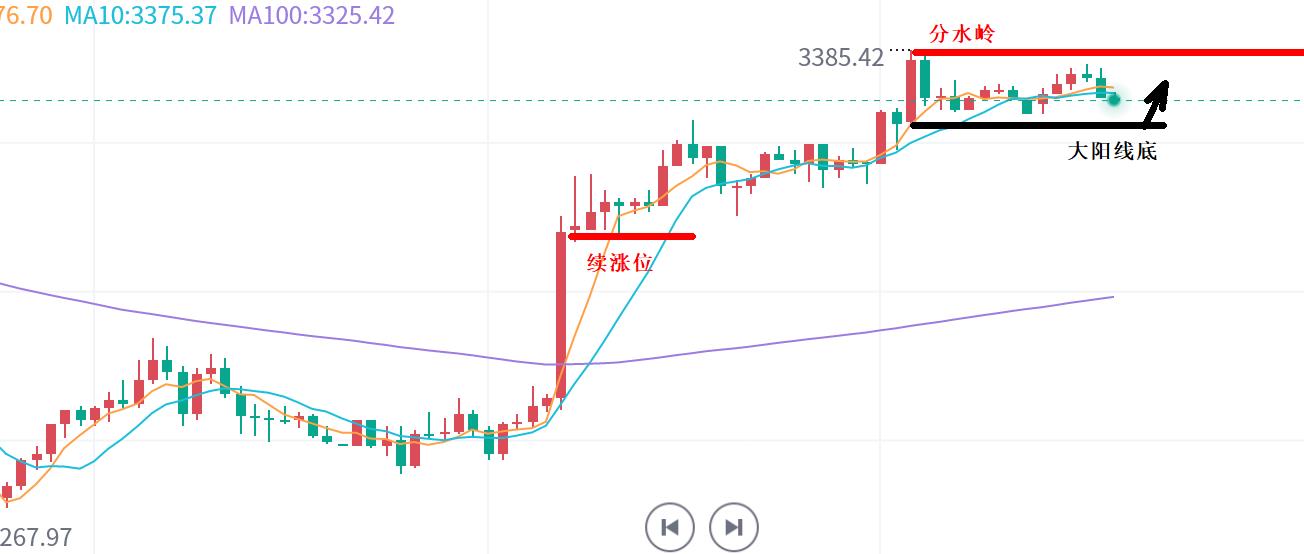强调前一日上升,第二日做多的三个点,关键位置就是小时线大阳线底部,位置3347,而昨日早间也是开盘冲高回落,二次上升。