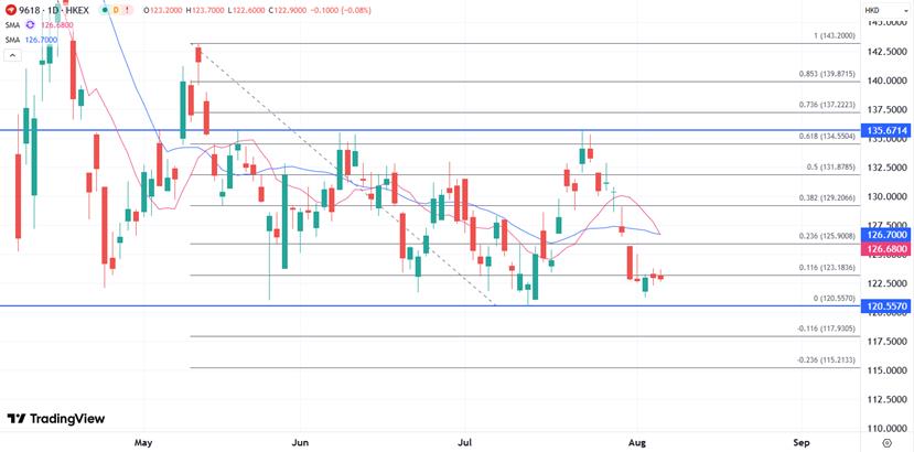 在宣布收购Ceconomy交易后,京东股价整体暂时缺乏利好回应,股价继续维持在7月中旬以来的低位,留意自5月底以来的交投区间底部在120港元附近的关键支撑。不过从更长线看,受交易进展催化,仍有上扬的空间,长期价值取决于协同落地效果。若成功实现“欧洲小时达”与成本优化,股价有望突破前高。