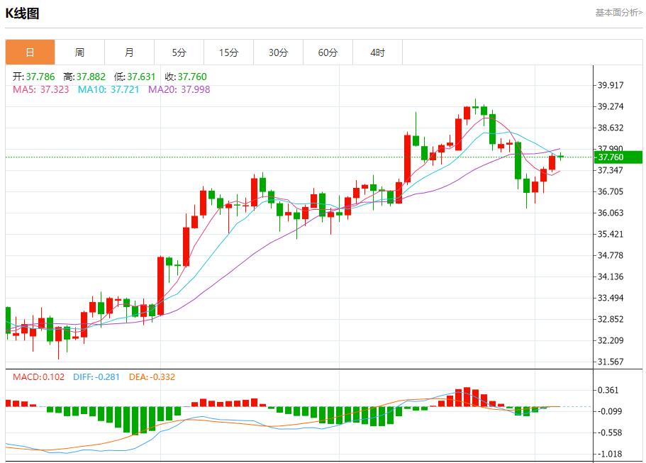 现货白银:截止北京时间20:23,现货白银下跌,现报37.758,跌幅0.06%。纽市盘前,(白银)的价格在最后一盘中上涨,以消除其早期因阻力位稳定而造成的损失37.85美元,试图获得可能有助于其突破该阻力位的积极势头,并试图卸载(RSI)上一些明显的超买条件,随着负面信号的出现,在短期突破看跌修正趋势线的喜爱中,其交投高于EMA50,形成积极支撑,增强了近期价格上涨的机会。