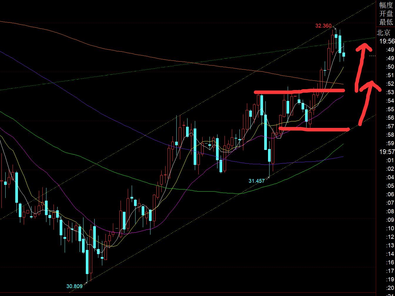 白银方面:今日白银走势比黄金明显强势,一路连阳走高,欧盘强,美盘就一般有二次上涨;关注两个位置,32一线顶底,极限是图中通道下轨31.8一线,触及企稳继续看涨,阻力目标32.3-32.4,看这里能否强势突破;