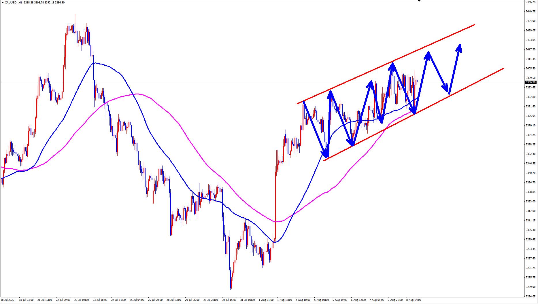 黄金1小时震荡上涨,现在在标准的上涨通道中运行,那么黄金如果继续在上升通道中运行,还是继续逢低做多,黄金现在下方支撑上移到3380附近一线,下周如果先回踩3380附近,那么黄金还是继续低多为主,上方阻力3420附近如果承压,也可以继续看通道内继续震荡上涨,可以先空。如果黄金下周最终突破通道,那么黄金多头才会开启新一轮的涨势,如果如果黄金跌破3380,而且开始在3380下方运行,那么下周黄金大概率就是将继续调整。