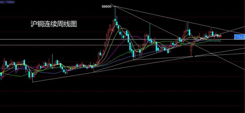 沪铜连续市场上周开盘在78416的位置后行情先回落给出78067的位置后行情强势震荡拉升周霞最高触及到了79023的位置后行情整理,周线最终收线在了78930的位置后,周线以一根下影线很长的中阳线收线,而这样的形态收尾后,本周78650多止损78450,目标看79050和79300和79500.