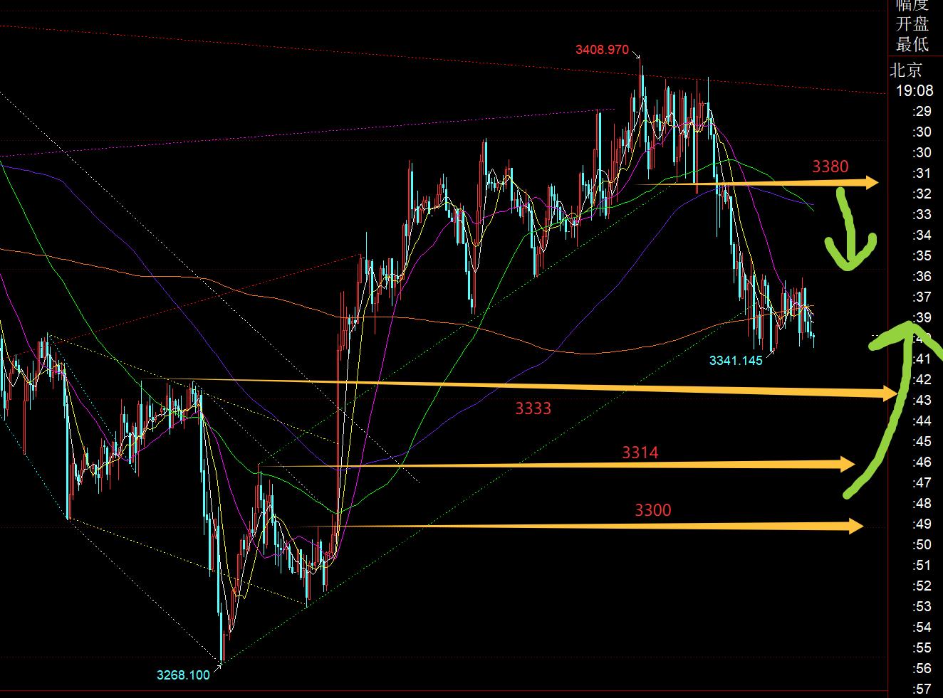 第三,黄金小时线级别:一波大幅下跌之后,今日围绕3340-3360这20米又是来回跑了半天,预期看跌阻力位3370-80,或者看涨支撑位3338-30都未触及;接下来就是今晚CPI数据,市场预期是通胀走高,且看公布会不会作假,它也是衡量9月降息的关键;从走势来看,日内仍偏弱,今晚倾向于先直接下跌,再借助底背离探底拉升走震荡;或者先急拉一波,再冲高回落也是走震荡;至于先急跌还是急拉,就看数据了;总归就是震荡,不太会有小单边出现,因为这接近四个月的收敛三角整理,总出现的三波走法都有类似共同之处,压制下调修正时间一般需三至四个交易日,可能需要本周五出现短期拐点企稳;今晚若先上冲3370-80出承压信号看回落下行,若先下跌,留意3333、3322、3314、3300这几个位置,分别是代表非农那一波拉升的顶底位置确认,618分割位置,786分割位置等;每一个位置出现企稳K,可短线看一定反弹空间,见好就收即可,价格打压越低,越要敢于试探反弹,拿住一个相对低位,不经意间会发现,没过几天,又是100米的拉升,已经循环走了至少四五次;