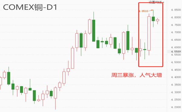 本周三,COMEX铜单日大涨5.48%,最高触及4.825美元/磅,次日延续涨势,最高触及4.851美元/磅,刷新年内最高纪录。铜是有色之王,市场关注度极高,周三的暴涨吸引了大量人气,有助于涨势延续。供需角度看,智利铜矿出口减少和新能源车市场拉动电力行业扩产,都对铜价形成支撑作用。短期走势来看,美元指数的下跌对COMEX铜价格形成明显支撑:周三铜价涨幅最大,同一天,美元指数也出现了本周最大的跌幅。考虑到特朗普的激进政策还将继续发酵,美元指数弱势格局大概率延续,铜价或许将持续受到提振。