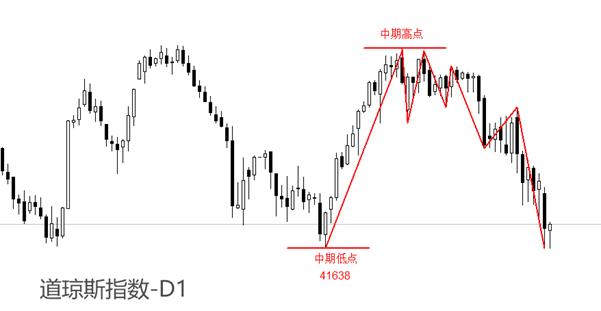 走势结构角度看,日线级别,道琼斯指数在1月13日出现中期低点,报41638点;之后在1月31日形成中期高点,报45013点。截至3月11日,尚未形成新的中期低点,意味着当前行情的中期走势为空头。不过,昨日最低点触及41610点,距离前一个中期低点41638较近,有可能形成双底结构。如果K线组合在此处形成底分形结构,未来有望出现新一轮反弹。相反,行情以长阴线跌破41638点后,中期空头趋势料将延续。