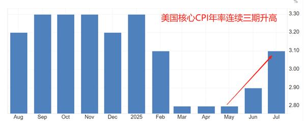 周二,美国劳工部公布关键通胀数据:7月未季调核心CPI年率为3.1%,高于前值2.9%,高于预期值3%。美国7月未季调CPI年率为2.7%,与前值持平,低于预期值2.8%。核心CPI年率升高0.2个百分点,并且超出温和通胀上限3%;名义CPI年率与前值持平,环比下降0.1个百分点。综合来看,剔除能源价格影响后,美国高通胀形势延续;加入能源价格影响后,物价走势有所疲软。