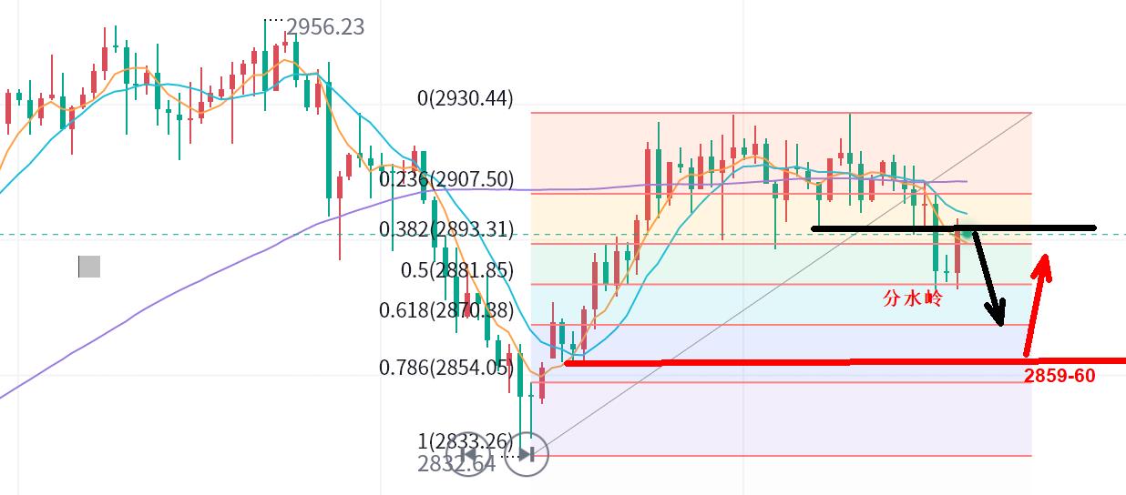 同时,一旦欧盘下跌,美盘破2880,下个支撑位618位置在2869,双底位置2859-60.