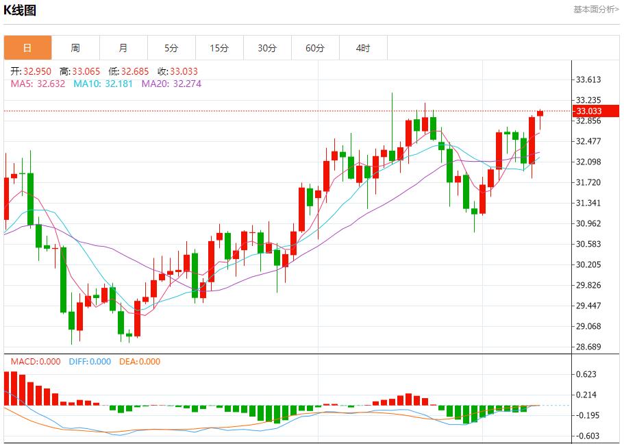 现货白银:截止北京时间20:20,现货白银上涨,现报33.017,涨幅0.30%。纽市盘前,白银价格向上反弹,突破32.86美元,并试图保持在此之上,强化了日内和短期继续看涨趋势的预期,为实现33.35美元和33.75美元的新目标开辟了道路。