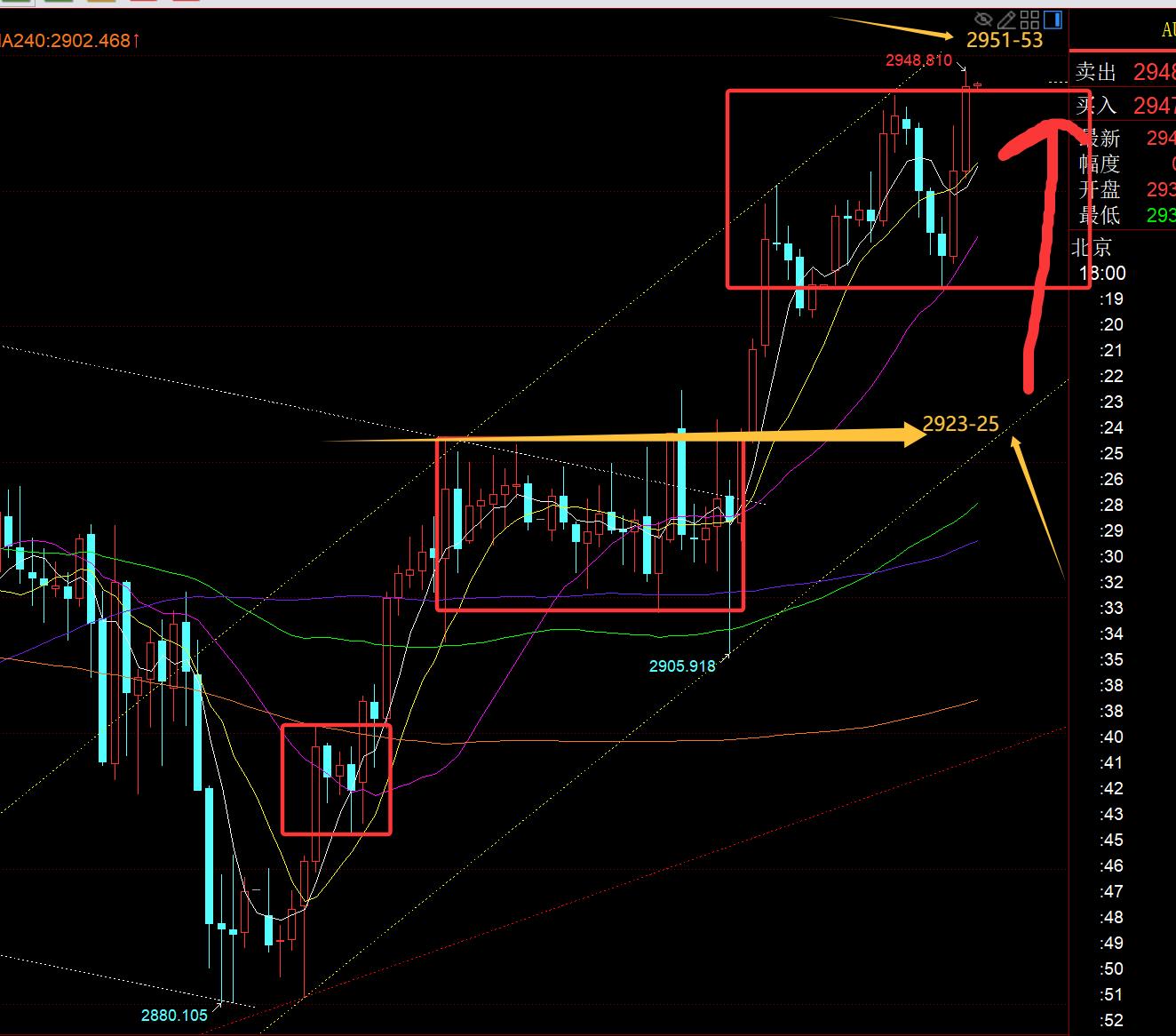 第一,黄金日线级别:昨日稳住于中轨继续收阳,略站上2930,原本今日是计划MA5日均线位置2919的上方继续去看涨,因为收盘于2933,离上周横盘压制阻力2930并不远,还不能完全确认为有效站上,今日再向下击穿2930进行回踩确认也是比较正常的;但白盘的走势是直接进行续涨,也不排除强势走连阳单边,去刷历史新高;因此,对于后市来讲,要继续保持顺势看涨为主;