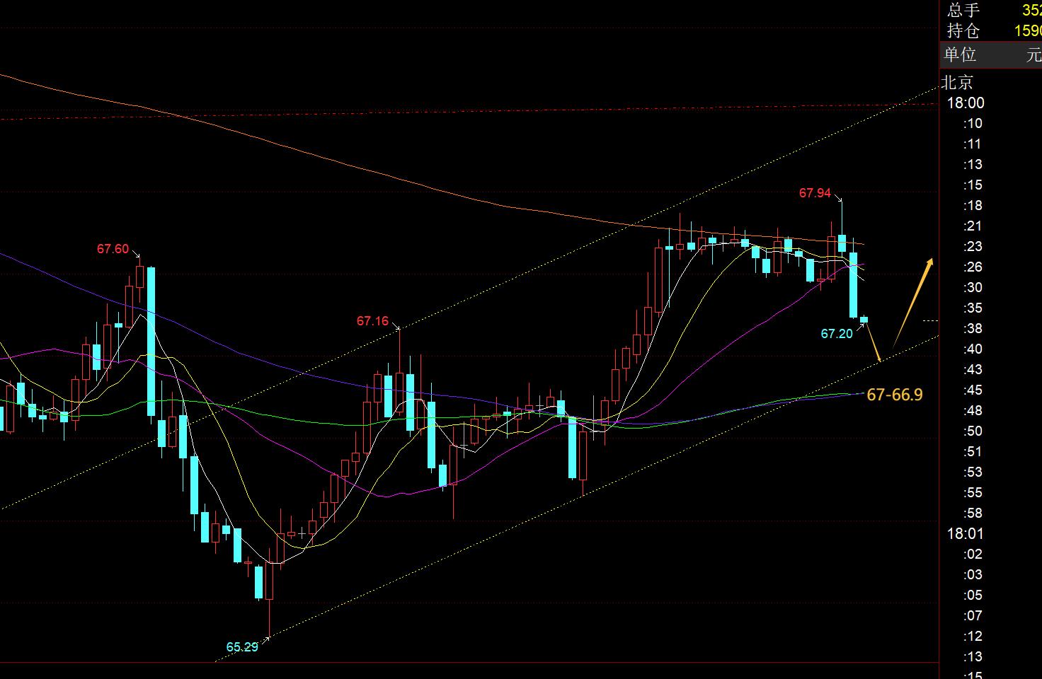 原油方面:按照图中通道,今晚等待下轨支撑67-66.9继续看涨,上轨阻力大概68.5一线,此位置是后市的关键,只有日线突破站上它,才可能迎来超跌反弹;