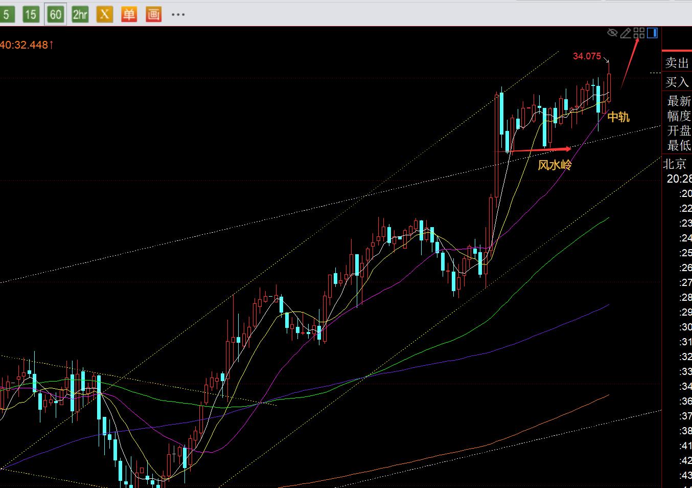 白银方面:和黄金图解基本一致,依托中轨逢低继续看涨,凌晨低点33.6一线作为风水岭防守,目标关注通道上轨34.3-34.4;