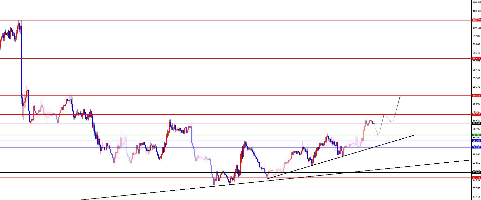 从多周期分析,周线级别来看近期价格在周线支撑上下盘整,本周重点关注98.30位置站稳,一旦站稳则中期多头将延续上行。在日线级别上,在上周价格压制在日线阻力位置下方持续震荡,目前日线阻力于98.20位置,价格在昨日进行向上突破站稳,后续则关注波段多头拉升行情。从四小时上看,四小时上是我们一直强调短期价格走势的关键,目前四小时支撑98.30-40区间,所以整体依托此区域可以继续看上行。从一小时上看,昨日价格正如笔者所言依托趋势线及四小时支撑上涨,后续关注进一步延续即可,上方短线关注98.70-99区域。