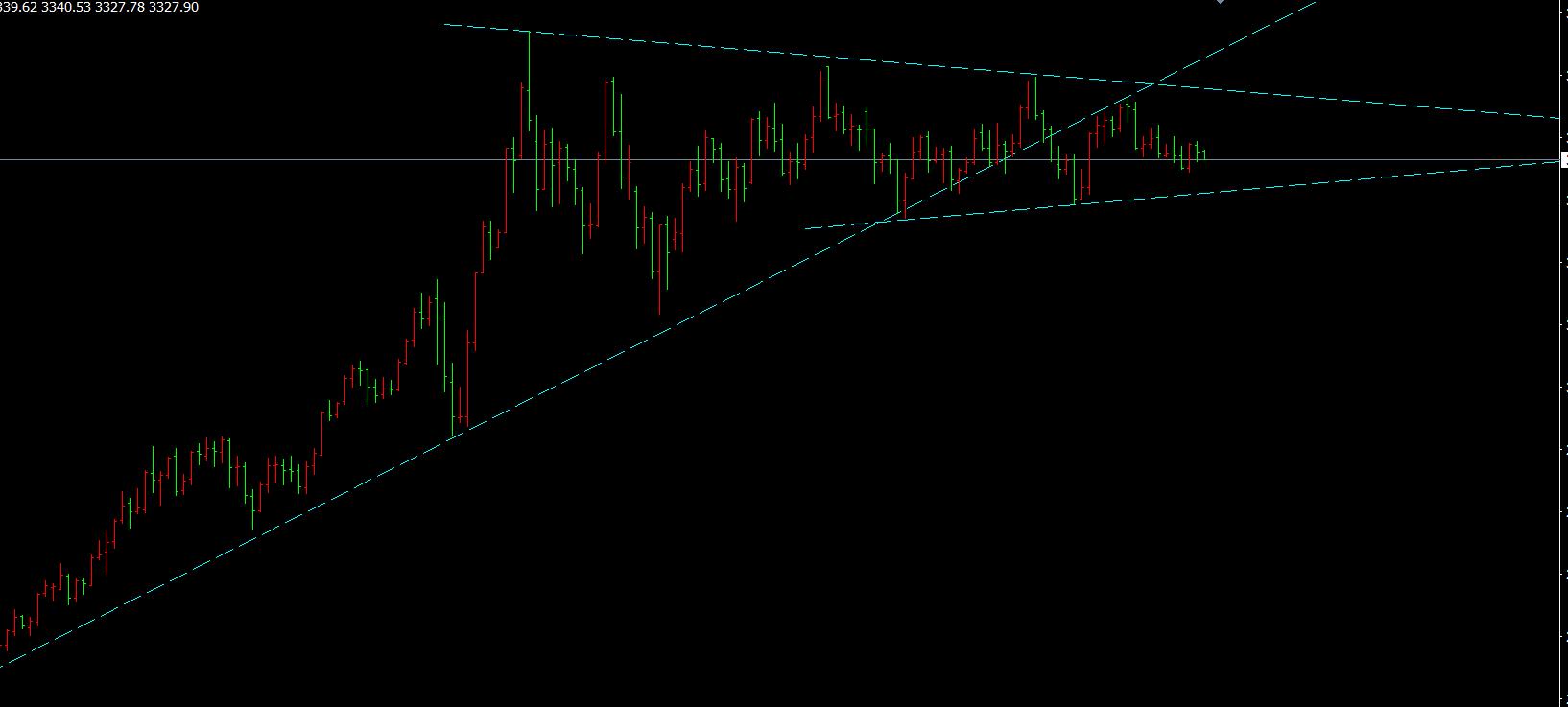 昨天黄金探底回升,价格到3325反弹,晚间收回36上后,价格以48-37之间展开窄幅震荡,收盘以一根小阴线报收。