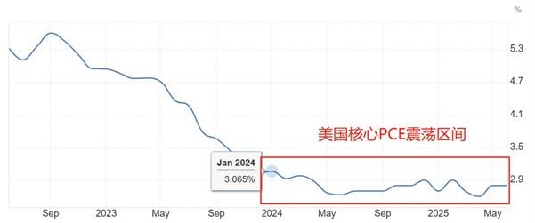 本周五20:30,美国商务部将公布7月核心PCE物价指数年率,前值为2.8%,预期值2.9%,预期微增0.1个百分点。历史数据看,2024年依赖,美国的核心PCE数据已经进入震荡期,上限3.065%,下限2.6%,一年多来,数据从未超出该区间。只要7月份核心PCE年率处于仍处于该区间之内,就符合历史规律,对美元和黄金的冲击不会太大。核心PCE数据和核心CPI数据共振。7月份核心CPI年率为3.1%,高于前值2.9%,意味着美国的物价水平在7月份普遍上涨。据此判断,7月份核心CPI年率大概率高于前值,只不过高处的幅度不一定是市场预期的0.1个百分点。当美国的核心PCE和CPI数据双双升高时,美联储倾向于维持限制性利率不变,利多美元指数,利空黄金及非美货币。