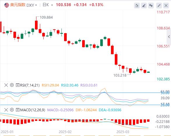 周一,由于美国零售销售数据不及预期,美元指数盘中跳水,截至目前,美元报价103.53。