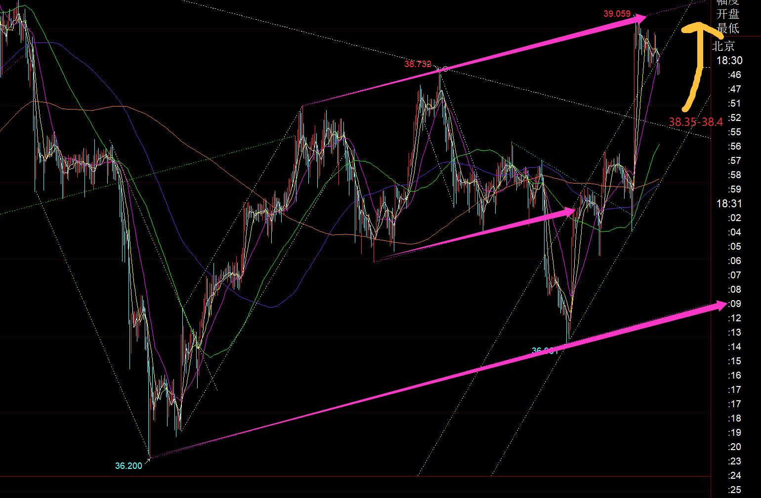 白银方面:周线和日线都是收报不错的大阳K,本周继续维持看涨为主;日线级别大阳收盘刚处于其中一个通道上轨位置,39.1一线是存在一定阻力,不宜直接追涨;从图中看,回踩重点关注的支撑是顶底位置38.4-38.35,靠近日线5均线,和50分割位置;这几日白银每次启动上拉之前,总容易出现一波诱空小急跌,一旦再出现此信号,就基本是日内相对低位;
