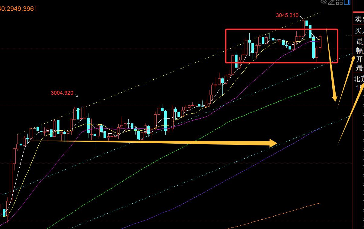 第二,黄金4小时级别:18点收报一根大阴,反包前面大阳,3045下出现压制信号,只是MA10日支撑还未有效失守,就还可能要盘整一些时间;能有效破位10日支撑,就可以指向中轨,也是共振于日线MA5日位置3007一线;