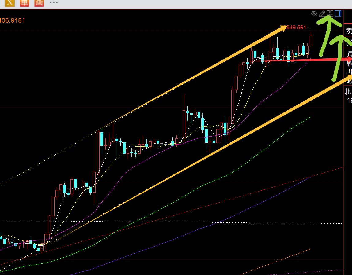 今日5均线支撑上移3480的上方,离此时的价格有70米距离,一旦距离越大,接近百米或更高,就要时刻小心冲高回落来急速修正,当然这不代表你可以去逆势空,作为单边强势趋势拉升中,一定记住只多不空原则不变,放弃抓回调,任何有抓回调的想法出现,结局基本是两头被打;此时逼近3550关口,再去追多风险也逐步加大,就耐心等待它出现回调下跌,企稳再继续看涨即可,只要一直维持短期5日,极限10日,就一路保持趋势单边看涨;