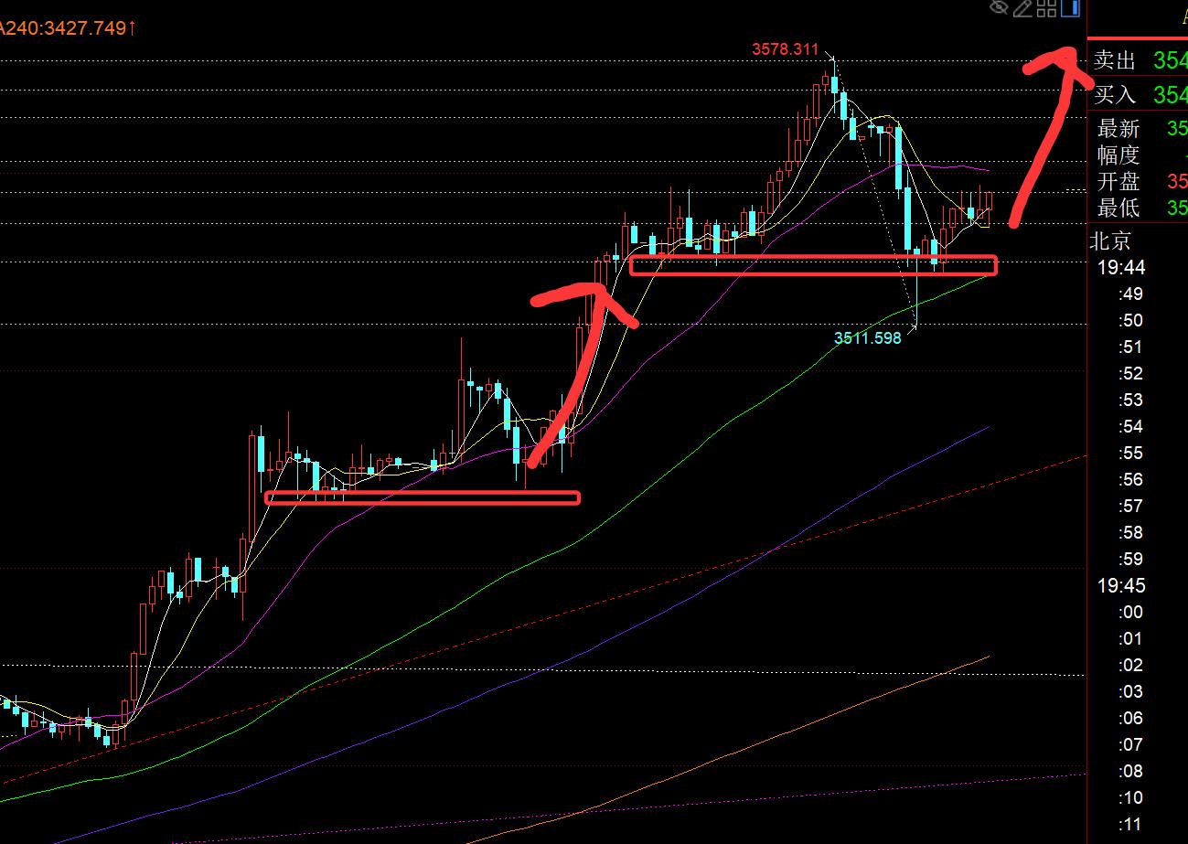 第一,黄金方面:昨日早间3521之上计划直接看涨,博续涨,最低3525,位置上略差几美金;而欧盘持续窄幅横盘,计划是等靠近小时线中轨企稳,稳定再继续看涨,等了半天一直触及不到中轨,美盘前连阳向上破日内新高,则晚间研报指出3532-28上可以提前去尝试看涨,但依旧不给机会,直接一路慢涨连阳上攻,最终抵达预期目标3555和3575;