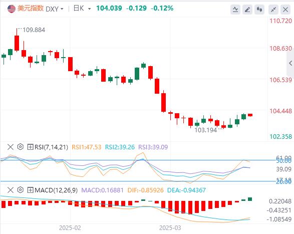 3月24日,北京时间周一亚市早盘,美元指数徘徊在104.03附近。上周五,因美联储官员表示不急于降息,美元指数本月首次录得周线上涨,最终收涨0.34%,报104.15。基准的10年期美债收益率收报4.2580%;对货币政策更敏感的两年期美债收益率收报3.9670%。受美元走强和投资者获利了结的影响,现货黄金美盘一度跌破3000美元关口,回调约40美元,但因地缘政治和美国经济的不确定性挥之不去,最终收复3020大关,收跌0.71%,报3022.79美元/盎司。现货白银最终收跌1.57%,报33.02美元/盎司。因市场担忧全球经济增长和关税风险,国际油价小幅回调。WTI原油收跌0.09%,报68.25美元/桶;布伦特原油收跌0.15%,报72.13美元/桶。