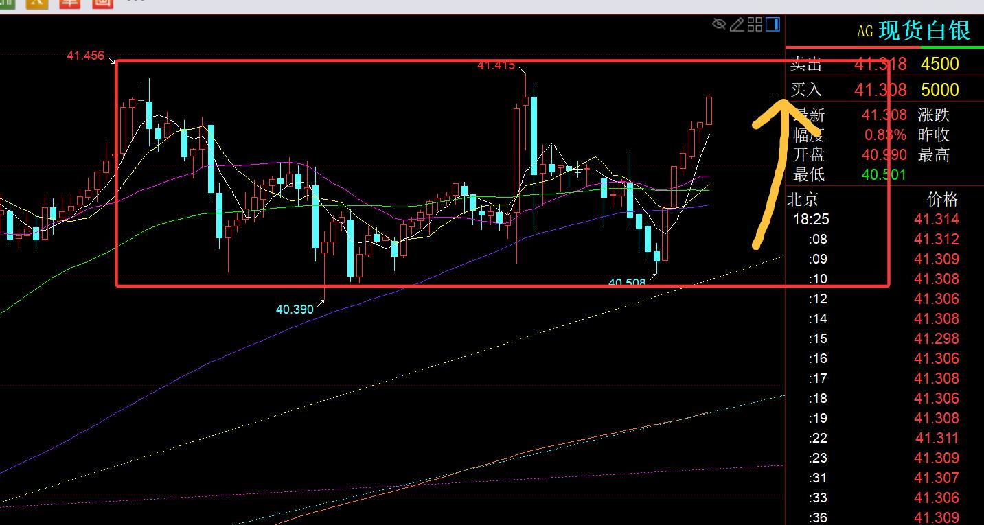 白银方面:周视频解读过,黄金处于单边延续拉升,而白银这几日处于高位区间整理,但也是依托整理的下轨支撑继续反复看涨为主;今日早间指出40.6-40.4继续看涨,符合一波拉升,目前又再次逼近41.4上轨;今晚若回踩40.6之上继续看涨,或40.8、40.6分批进行,一旦突破站稳41.4,或指向42-42.2;