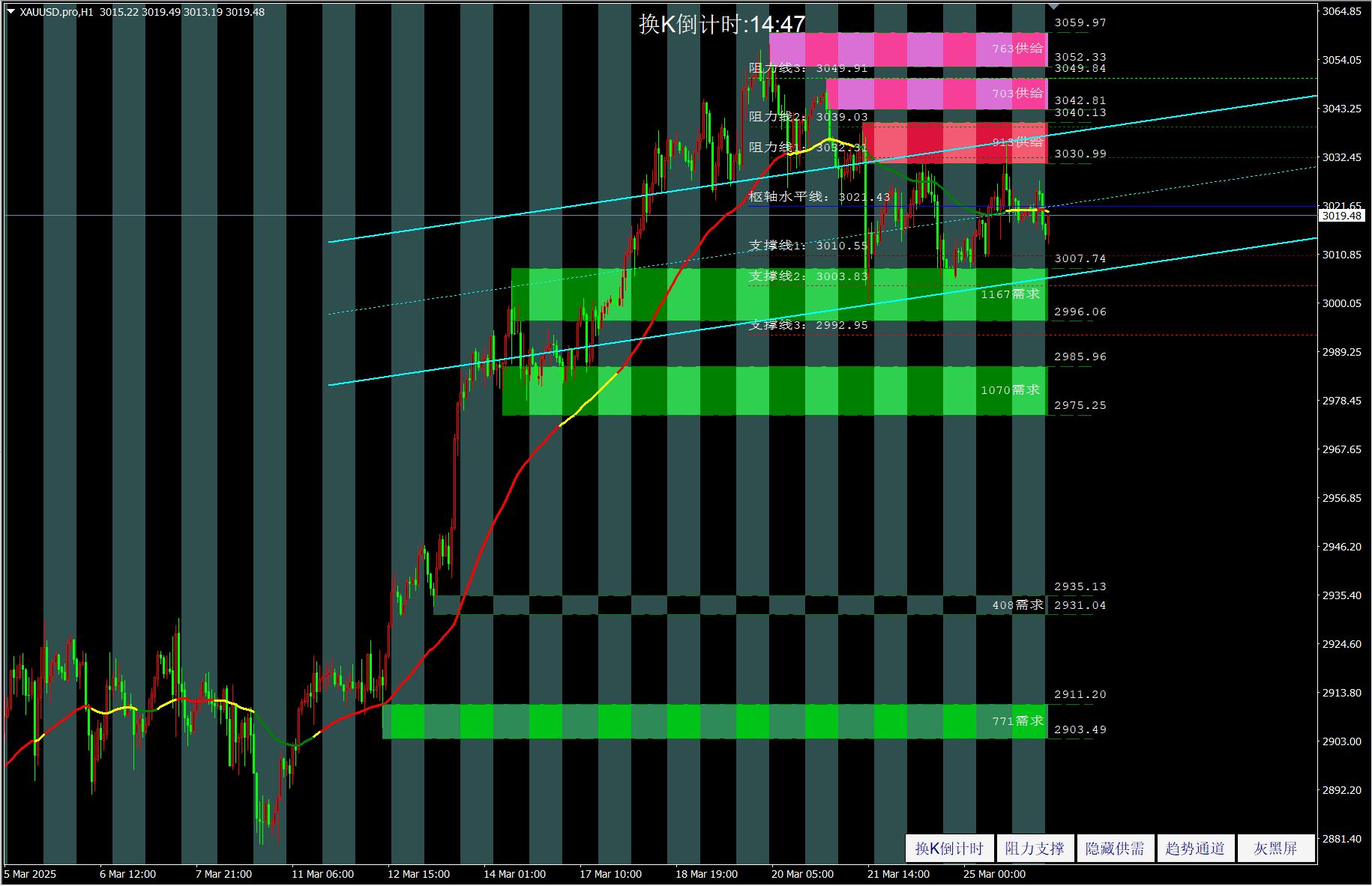我们结合《莫尔趋势系统模型》来看,短期内下方支撑位于3004附近,进一步支撑位于2992,上方初步压力位于3022一带,进一步压力位于3032,也就是往上的空间要大于下行再回撤的空间,接下来的欧盘若能接近下方整数关口支撑可择机跟多,目标上看至3020附近。