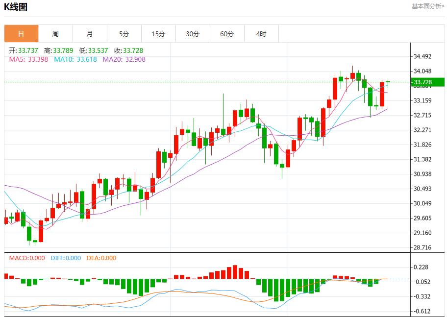 现货白银:截止北京时间20:20,现货白银上涨,现报33.732,涨幅0.01%。纽市盘前,银价在日内水平进行波动交易,价格下跌以发泄随机指标中的超买饱和,并依靠50蜡烛SMA的支撑,再次提振价格,因为它沿着趋势线交易,主要上升趋势占主导地位。