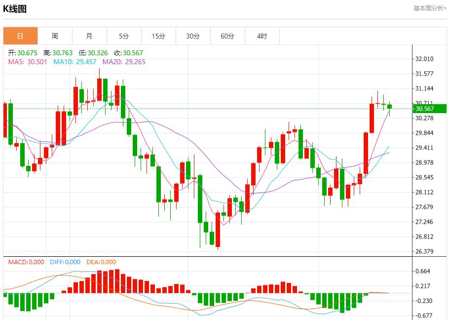现货白银:截止北京时间20:21,现货白银下跌,现报30.593,跌幅0.23%。纽市盘前,白银价格现在提供了积极的交易,以测试30.65美元的第一个阻力,这是今天预期负面情景的第一个保护因素,因为我们主要是在等待测试30.06美元,提醒你突破30.65美元,然后是31.00美元水平,将推动价格实现更多收益,并在即将到来的交易中转向上涨。