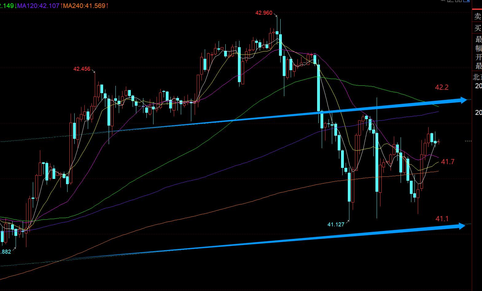 白银方面:日线级别昨日回踩了10均线,刺破了下,尾盘收盘重回10日之上,今日还需继续关注10日得失,即41.6-41.7是否能重新站上,才能考虑短期修正是否结束;从上图看,暂时围绕蓝色通道内运行,42.2阻力,41.1支撑,大区间是围绕这个;中间就留意小时线中轨41.7,触及稳住它,则先去尝试试探上轨42.2一线,突破站上它,才能走出修正,回归短期强势上攻;