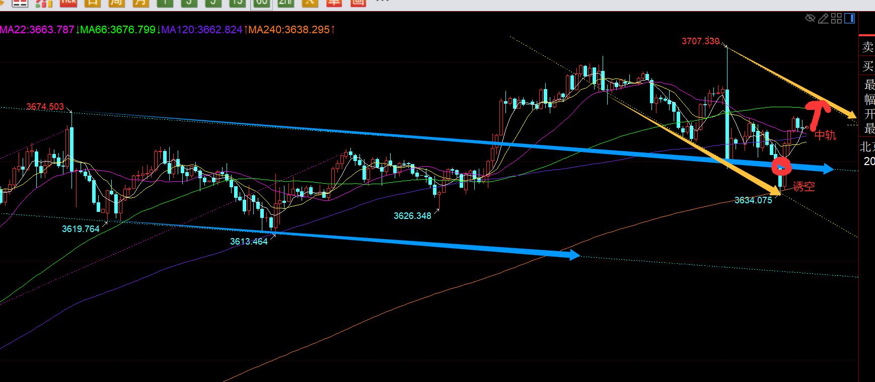 第三,黄金小时线级别:隔夜冲高回落,今日早间先出现一波拉升试探了中轨,承压之后来了一波回测,欧盘前刺穿失守了隔夜低点3645,但很快欧盘又探底拉升,出底部大阳回归图中蓝色通道之上,这说明3634那个击穿是一个假象,诱空;并且连阳拉升突破中轨有所站上,也刷了日内新高,今晚先留意回踩中轨支撑得失,此时有所略下移至3663.7,能一直收盘稳住此位置,那么美盘就可以有一波二次走高,因为一波小V拉升之后,一般都会延续下,短期阻力3680-3683,618分割压制以及图中黄色通道上轨承压处,要进一步直接走强上行,还需攻克此处才行;当然,若反复又失守中轨收阴下去,那么可能就是区间震荡上下来回串了,届时回抽中轨过不去就要提前调仓,等好的低位企稳再看;
