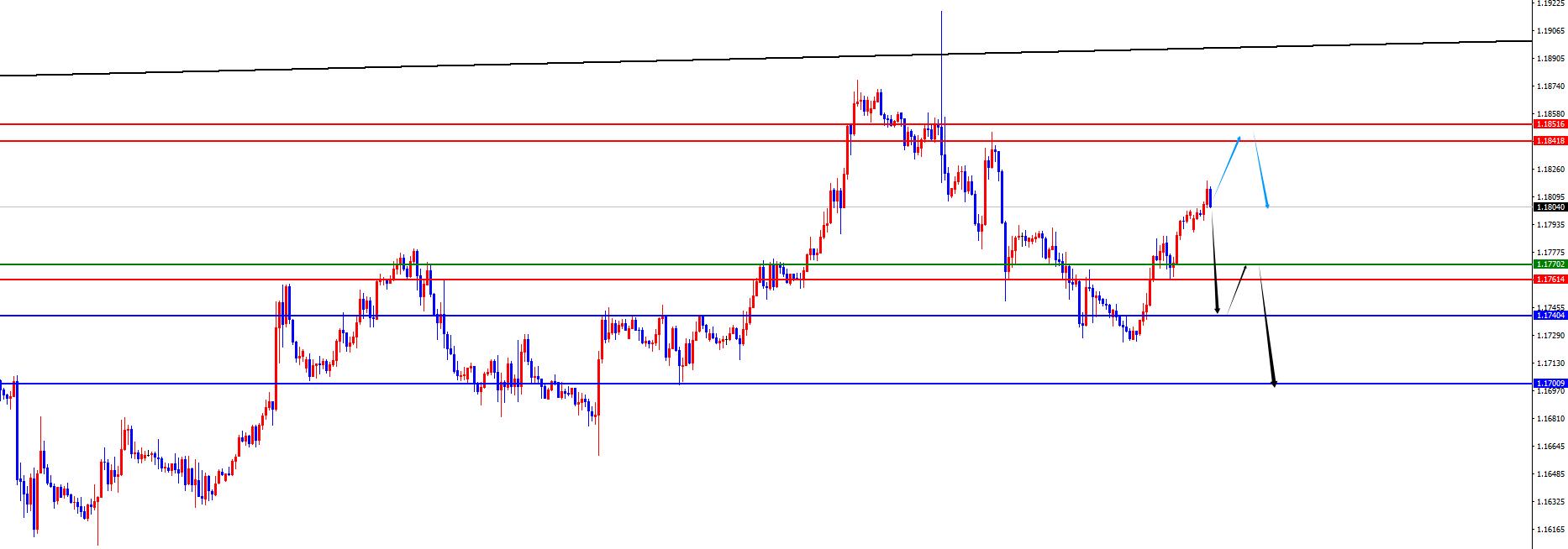 欧美1.17840-50区间空,防守40点,目标1.1760-1.1700(如若先跌破四小时支撑可以提前看承压)