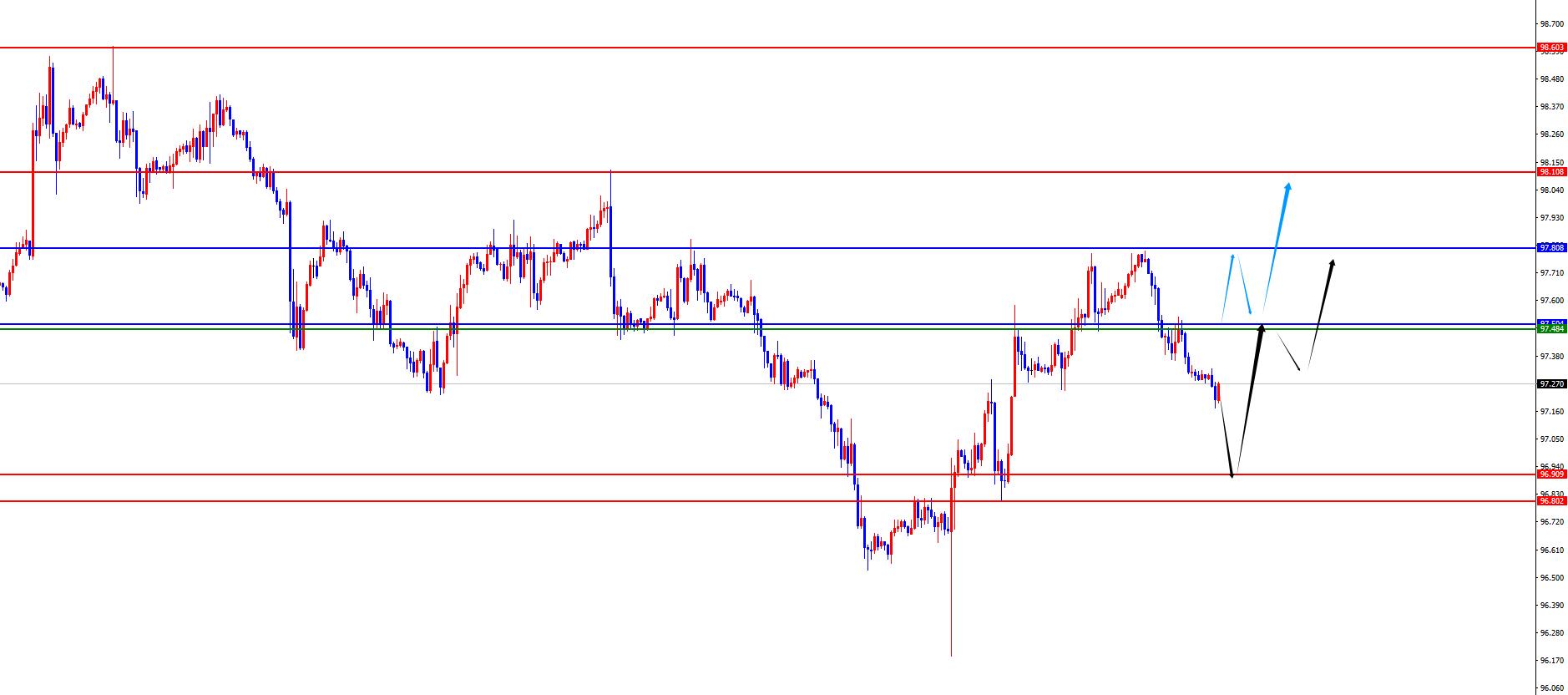 从多周期分析,周线级别来看近期价格在周线关键上下盘整,目前周线阻力于97.80区域,本周需要关注此位置能否站稳是关键,一旦站稳则中期多头将进行延续。从日线级别看,随着时间的推移目前日线支撑于97.50区域,后续关注此位置站稳再度进一步上涨。从四小时上看,目前看四小时阻力于97.50位置,此位置和日线阻力共振,由于整体大方向美指处于低位震荡筑底的表现,所以后续一旦突破则关注进一步上涨。一小时上暂时关注96.80-90区间支撑,后续关注测试到此区域看进一步上涨。如若提前站稳四小时阻力则关注提前上攻,大家整体注意市场节奏。