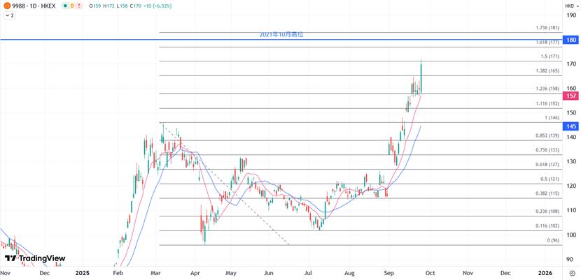 如果阿里巴巴在业务重组、云计算和AI商业化、以及利润增长方面能够交出实实在在的答卷,会有更多国际资本开始重新审视并配置阿里巴巴,为股价的中长期上涨打开空间。当前技术面继续瞄准2011年10月高位180港元为目标,突破的情况下将指向200港元。