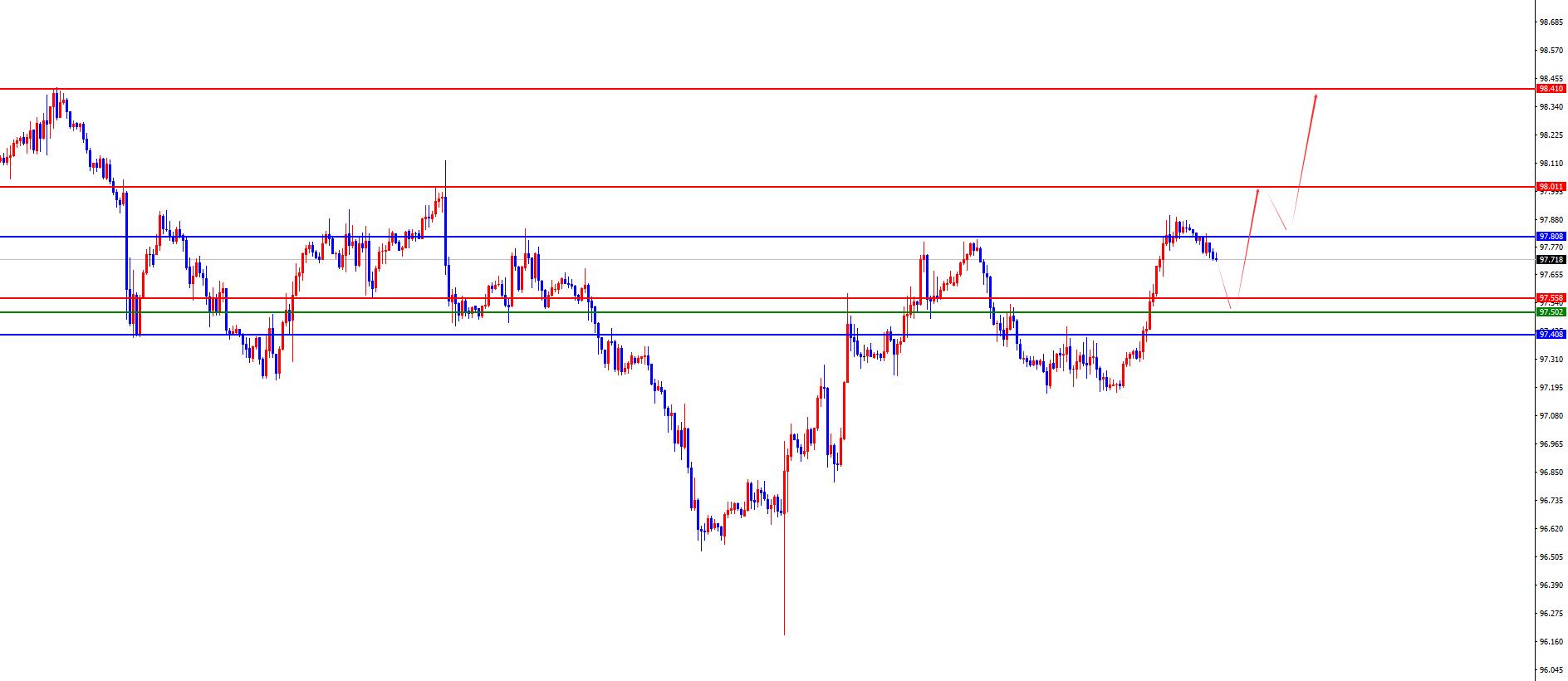 从多周期分析,周线级别来看近期价格在周线关键上下盘整,目前周线阻力于97.80区域,本周需要关注此位置能否站稳是关键,一旦站稳则中期多头将进行延续。从日线级别看,随着时间的推移目前日线支撑于97.40区域,后续关注此位置站稳再度进一步上涨。从四小时上看,目前看四小时支撑于97.50位置,价格在昨日已经站上日线及四小时阻力,后续关注此区域支撑进一步延续上涨。同时一小时上价格短线向下调整,待后续调整至关键支撑后再看进一步上涨,上方关注98-98.40区域。