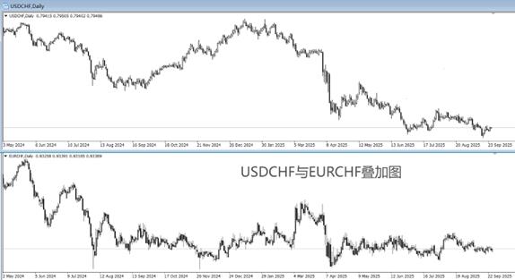 瑞郎系货币对中,USDCHF和EURCHF关注度最高。上图为美瑞和欧瑞的叠加图,两者走势共振性较强。中期趋势看,美元和欧元相对瑞郎均存在贬值趋势,这看似与瑞郎持续降息的影响相反。实际上,瑞郎是避险货币,虽然2015年的瑞郎黑天鹅事件令瑞郎的避险属性下降,但其依旧是国际资金追捧的对象。在美国总统特朗普一系列关税政策下,全球经济前景预期悲观。由于美元信用下降,美元指数下跌,瑞郎的避险属性凸显,这才导致即便瑞士央行降息,也还是导致瑞郎升值的原因。