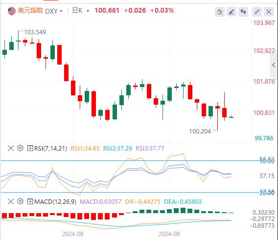 9月20日,北京时间周五亚市早盘,美元指数徘徊在100.66附近。周四,因美联储降息50个基点,投资者开始考虑美联储更多的降息,美元指数先涨后跌,其在亚盘一度冲上101.47的日内高点,而后回吐全部涨幅,并失守101关口,最终收跌0.3%,报100.63。美债收益率涨跌不一,基准的10年期美债收益率小幅回升,收报3.715%;对货币政策更敏感的两年期美债收益率收报3.590%。现货黄金日内大涨1%,一度重回2590美元上方,但未能站稳此处,最终收涨1.07%,报2586.56美元/盎司。现货白银最终收涨2.43%,报30.78美元/盎司。因美联储大幅降息和全球库存下降盖过了市场对需求的担忧,原油延续近期回升趋势。WTI原油日内一度大涨3%,并冲上70美元大关,最终收涨2.85%,报71.03美元/桶;布伦特原油收涨2.42%,报74.11美元/桶。