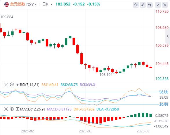 3月31日,北京时间一亚市早盘,美元指数徘徊在103.85附近。上周五,在美国陷入经济衰退的担忧中,市场更关注支出数据而非通胀数据,美元指数在PCE数据利好的情况下不升反跌,最终美元指数收跌0.26%,报104.01。基准的10年期美债收益率收报4.2390%;对货币政策更敏感的两年期美债收益率收报3.9220%。特朗普最新的关税政策引发了投资者对全球贸易战爆发的担忧,避险情绪增强,现货黄金创下新高,收涨0.94%,报3084.33美元/盎司,创下今年第18个纪录高位。因投资者获利了结,现货白银收跌0.77%,报34.11美元/盎司。因担心美国关税战可能引发全球经济衰退,国际油价回调。WTI原油收跌1.25%,报68.97美元/桶;布伦特原油收跌1.23%,报72.40美元/桶。