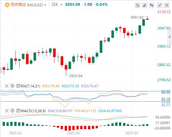 周一亚盘,黄金交投3084.09附近。周一亚市早盘,金价上涨至约3090美元。由于担心美国总统唐纳德·特朗普最新的关税措施可能引发全球贸易战,这种贵金属在接近历史高位时保持上升趋势。特朗普上周宣布对进口汽车和轻型卡车征收25%的关税,计划于4月3日生效。这一措施是在对钢铁和铝材征收25%固定关税的基础上提出的,特朗普还将在周三宣布即将实施的对等关税。与贸易战和全球经济不确定性相关的持续担忧推动了这种传统避险资产——黄金的价格上涨。