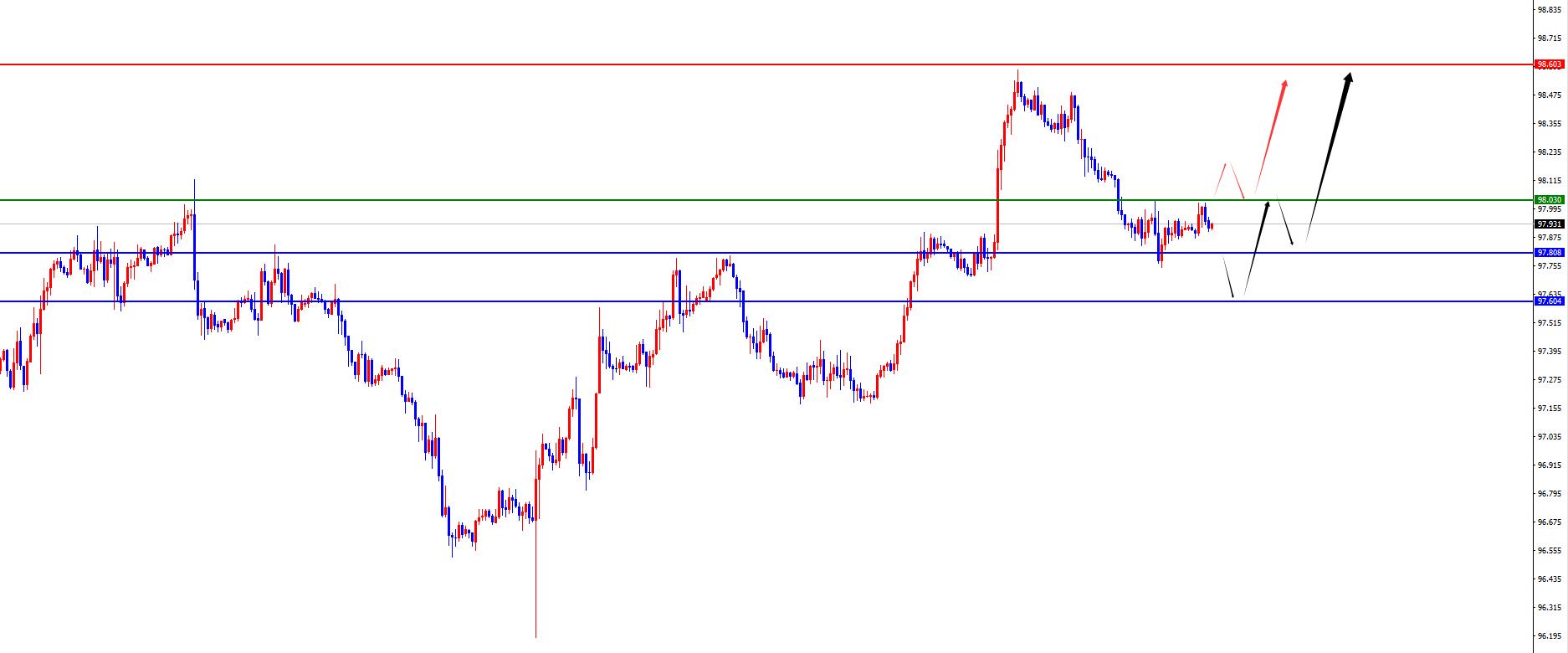 从多周期分析,周线级别来看近期价格在周线关键上下盘整,目前周线支撑于97.80区域,同时在上周价格站上周线阻力,后续看中期看多头延续。从日线级别看,随着时间的推移目前日线支撑于97.60区域,价格此位置之上波段进一步上涨。从四小时上看,目前看四小时阻力于98位置,目前价格在此位置下方,所以短线还是处于承压修正的状态,后续一旦站稳则关注进一步延续,否则的话需要谨防测试日线支撑后再上涨。一小时上目前价格短线偏向于震荡。所以综合看保守者可以等待突破98位置后直接追单或者意外探底至97.60区域后多,激进者目前可以轻仓先布局。