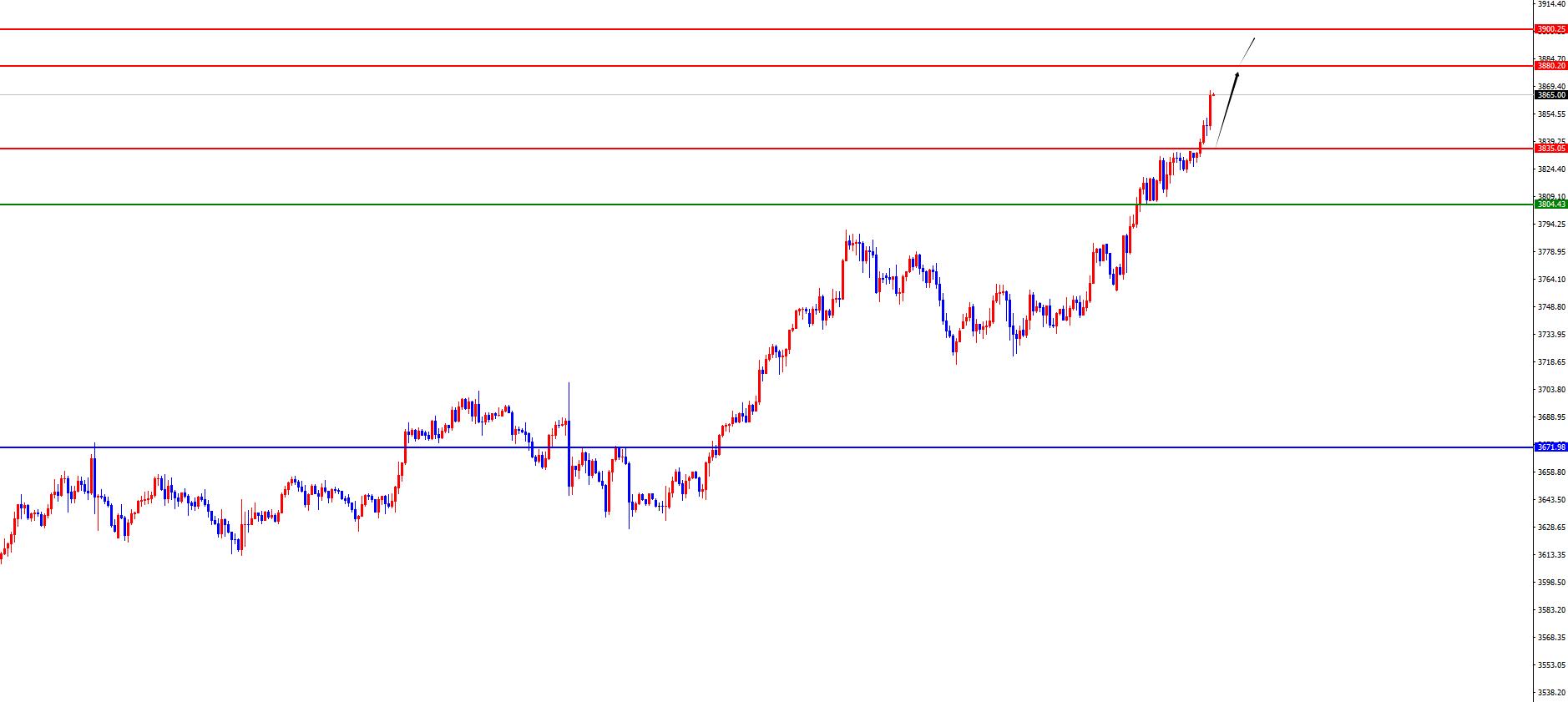 从多周期分析,首先观察月线节奏,月线上价格8月份大阳收尾,整体看价格依旧多头运行,从长线上看3000位置是长线走势的分水岭,价格在此位置之上长线多对待即可。从周线级别看,价格在周线支撑之上,目前周线多空分水岭于3480位置,价格在此位置之上中线多对待即可。从日线级别看,暂时需要关注3720区域支撑,此位置之上波段多对待,目前继续右侧交易方式对待。从四小时上看,在上周五价格突破四小时阻力后再度上涨,所以短期价格处于多头,目前四小时支撑于3805位置,价格在此位置之上短期继续多头对待。一小时上价格目前强势多头延续中,昨日强势收盘在高位,同时今日早盘再度强势飙升,则日内价格只要在早盘低点之上继续强势多对待即可,后续关注3880-3900区域。